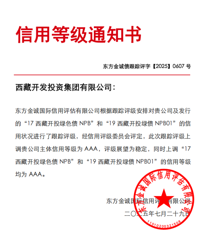 7月29日,經國內權威信用評級機構(東方金誠國際信用評估有限公司)評審認定,西藏開發(fā)投資集團有限公司(以下簡稱“西藏開投集團”)獲評AAA主體信用等級,評級展望為“穩(wěn)定”,成為自治區(qū)第一家國有AAA企業(yè),標志著自治區(qū)成功培育出首家本地主體信用等級AAA企業(yè),填補了我區(qū)最高等級國有信用主體的空白。