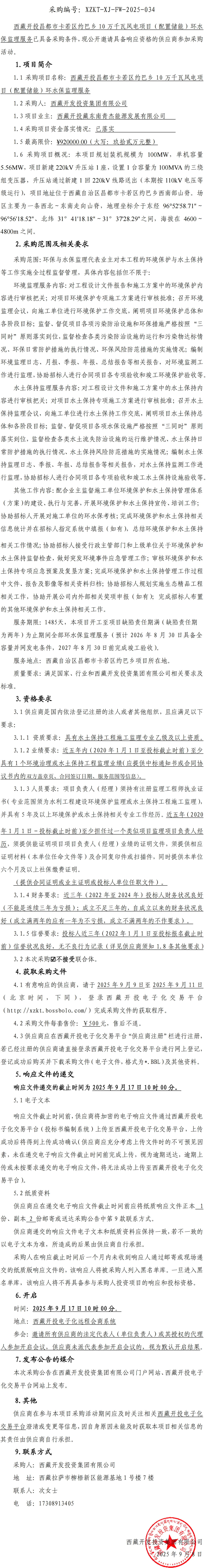 西藏開投昌都市卡若區(qū)約巴鄉(xiāng)10萬千瓦風(fēng)電項(xiàng)目(配置儲(chǔ)能)環(huán)水保監(jiān)理服務(wù)詢比采購公告